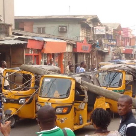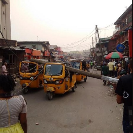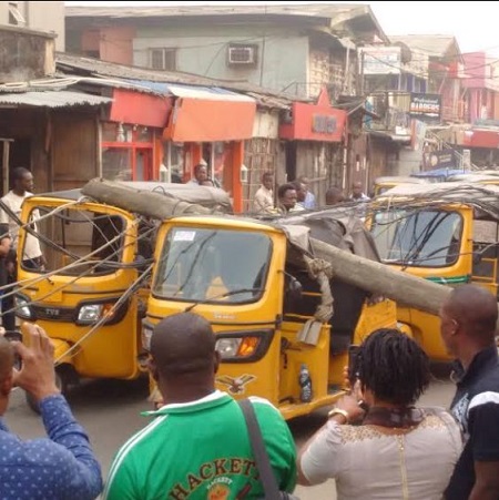 An electric pole fell this morning on two commercial tricycles known as Keke NAPEP at Oriyomi street in Ikeja area of Lagos.